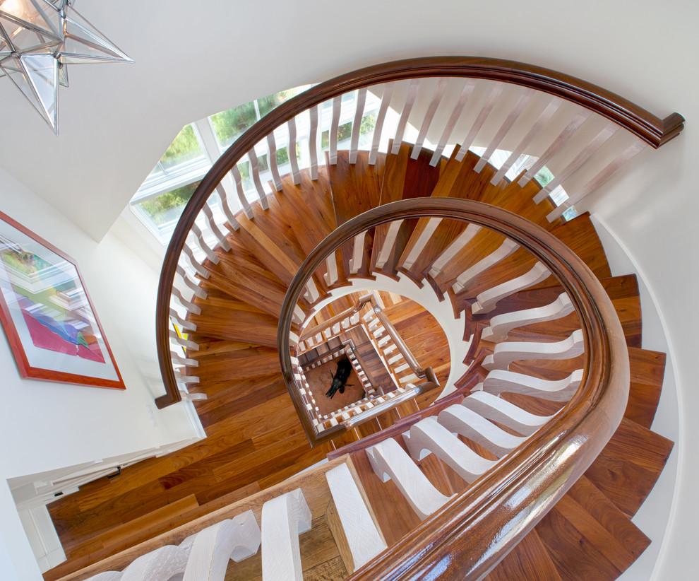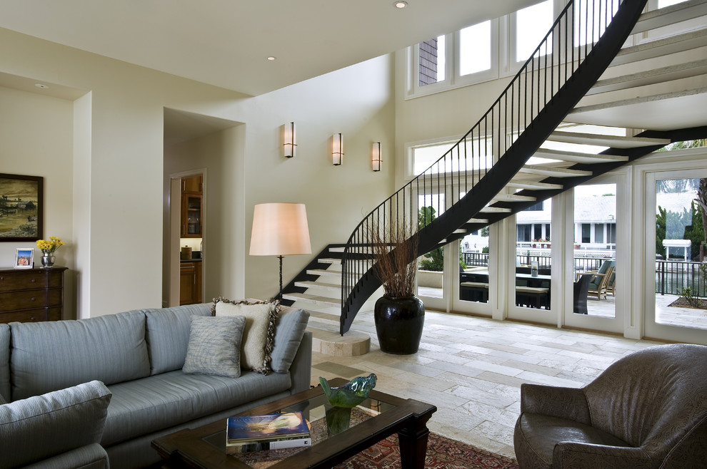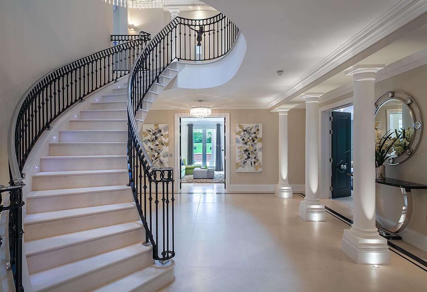 2、弧形樓梯設(shè)計美觀大方,在造型上不像直梯那樣吊板,色彩上可以和室內(nèi)色彩統(tǒng)一,也可以選擇對比色調(diào)造成強烈反差,可以達到滿意、優(yōu)美的效果。