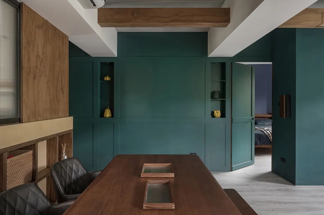 主臥以海軍藍為主色系,給人深邃沉穩(wěn)且安定之感。