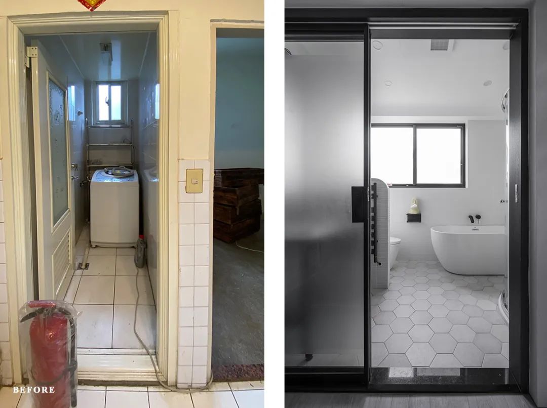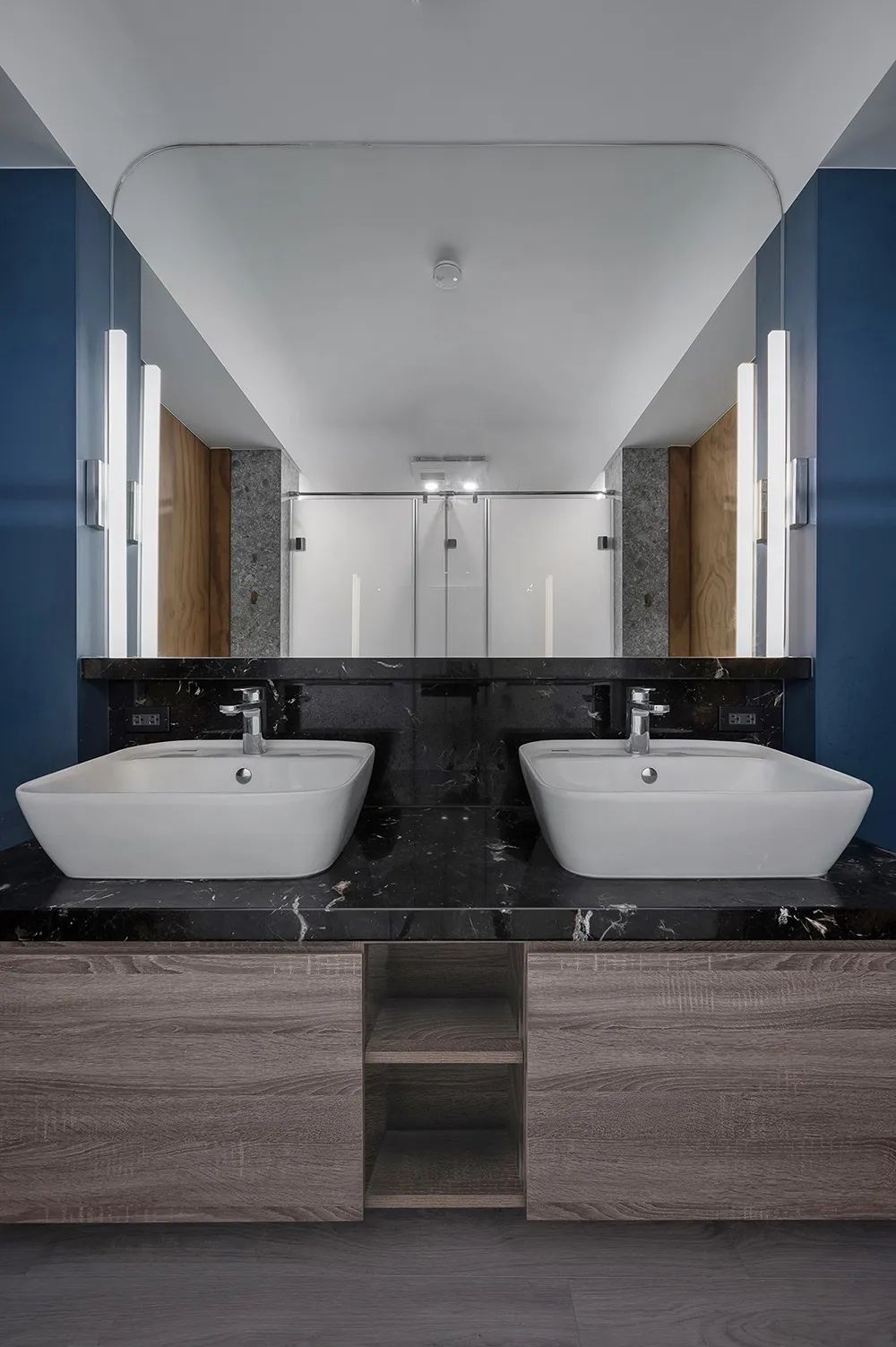 屋主希望多一個衛(wèi)浴間,因此除了擴大靠近主臥的浴廁范圍,還把洗手臺外移改成雙洗手臺的樣式,并且將原本的儲藏間與洗衣間打通,規(guī)劃成“四件式”的配置。