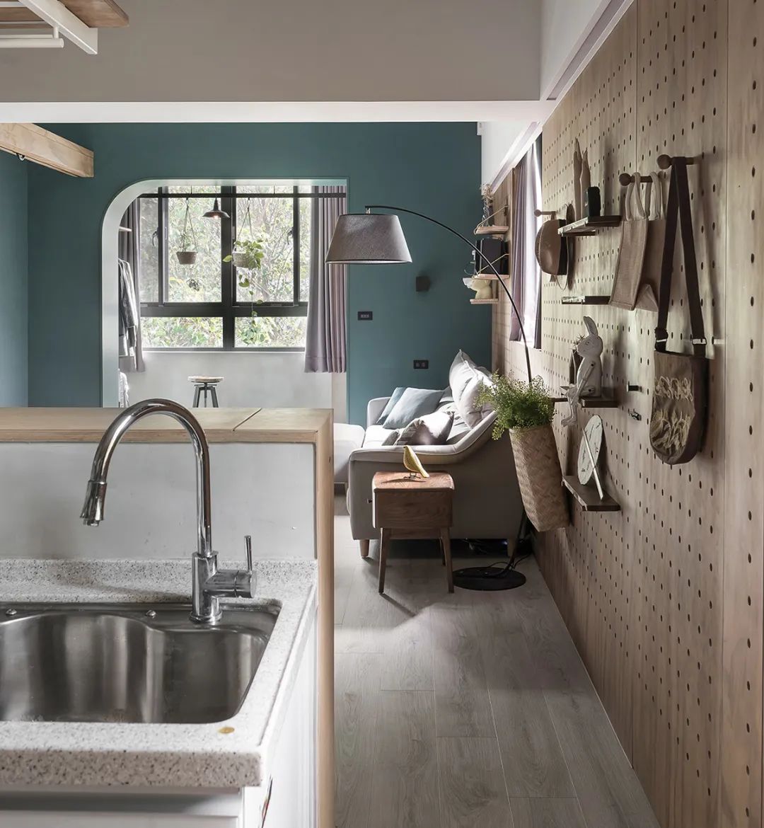 打破廚房藏于角落的宿命,改造時把它往前挪移,結合長虹玻璃拉門與活動洞洞板門板的方式,巧妙地將廚房改成半開放式,既可以阻隔油煙又保證空間的流暢感。