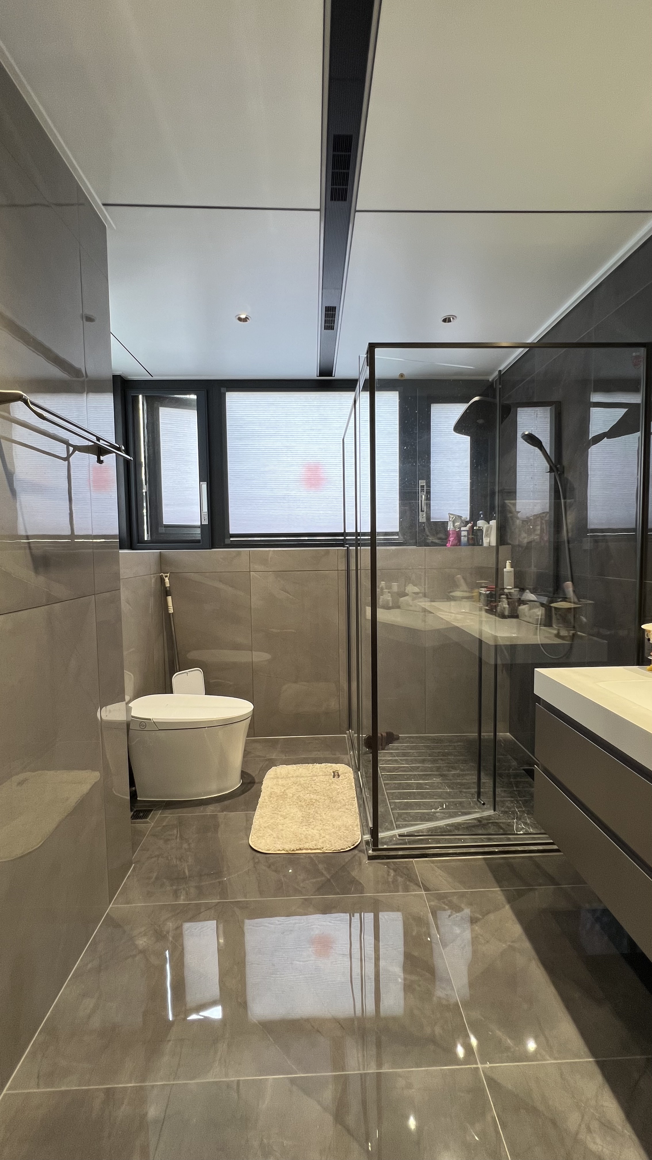 懸浮洗手臺(tái)是特意設(shè)計(jì)的,懸空看著輕巧,下面打掃也不費(fèi)事,臺(tái)面上擺個(gè)牙缸、擠個(gè)牙膏,倆人一起洗漱也不擠,鏡子一照,日常的煙火氣就出來(lái)了。頂面那線性風(fēng)口,低調(diào)又實(shí)用,換氣、取暖都靠它,也不破壞整體的簡(jiǎn)潔感。