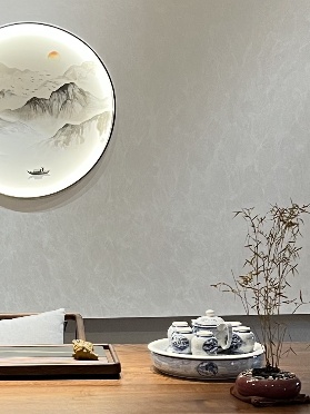 利用斜頂天然的縱向延伸感,以素色藝術漆打底,營造出如山水長卷般的朦朧意境。圓形山水掛畫恰似 “窗含西嶺千秋雪” 的畫框,與原木茶桌、古樸茶器呼應,讓空間自帶東方禪意。