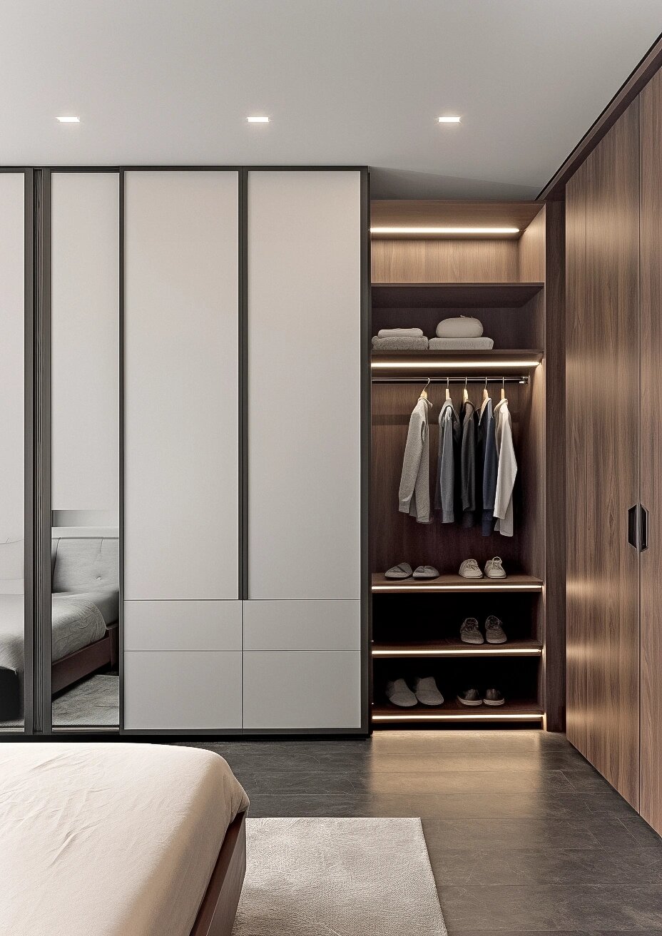 設(shè)計(jì)上超用心,開放式與封閉式柜體結(jié)合,開放式區(qū)域用暖光烘托,找衣物一目了然;封閉式柜體藏起雜物,讓空間整潔又有呼吸感。不同區(qū)域劃分清晰,掛衣區(qū)、疊放區(qū)、鞋履區(qū)等,把收納需求全安排明白,再多衣物也能井井有條。